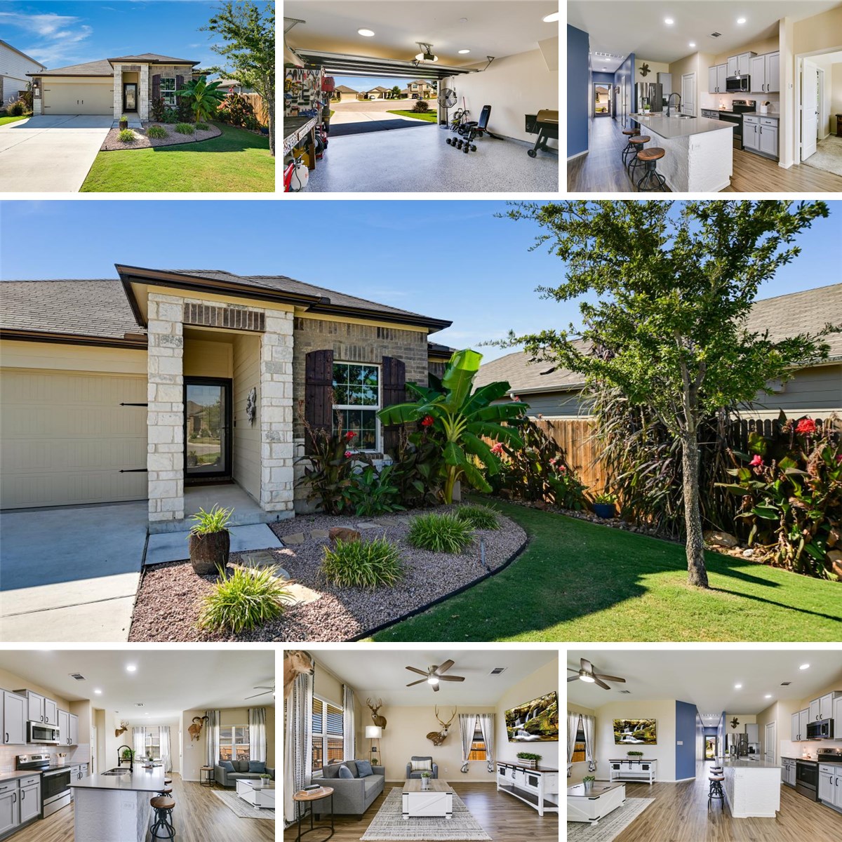 Built in 2020, this well-maintained 3-bedroom, 2-bathroom home combines modern style with everyday comfort. The inviting open floorplan features Shaw Rigid Core Vinyl “Whispering Wood” floors, Quincy flat-panel cabinets, and Silestone quartz countertops accented by a Logic White broke joint tile backsplash for a clean, contemporary look. The kitchen is equipped with stainless steel appliances, ideal for cooking and entertaining. Both bathrooms include cultured marble vanity tops, while the primary suite offers a walk-in closet for added convenience. High-efficiency lighting has been thoughtfully added above the showers, baths, and in the garage, enhancing both brightness and energy savings. Exterior highlights include ACME Mocha Brown Antiqued Brick with Ocean Blue Stone and white mortar, a covered back patio, decorative and protective garage flooring, gutters, and an automatic sprinkler system for easy maintenance. Situated on a large cul-de-sac lot, this home enjoys a lower 2.37% tax rate and access to Sonterra MUD amenities, including a pool, park, skate park, and splash pad. With its stylish finishes, thoughtful upgrades, and desirable location, this home perfectly blends comfort, quality, and value.