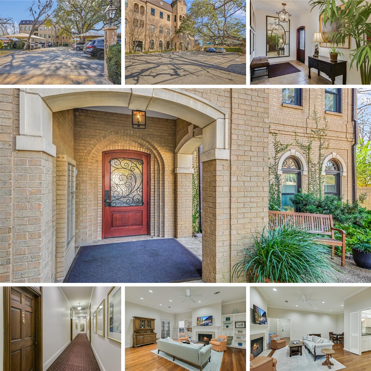 Fabulous single-level 3-bedroom downtown condo showcasing wood floors, soaring ceilings, and a light-filled living area with wood-burning fireplace—ideal for both everyday comfort and entertaining. The spacious primary suite opens to a private covered balcony overlooking the tranquil community pool, offering a true urban retreat. Guest bedrooms also enjoy access to a covered balcony, perfect for quiet mornings or evening unwinding. Residents benefit from a beautifully maintained pool and two assigned parking spaces—one covered, one uncovered. Just minutes from Lady Bird Lake, premier dining, shopping, and the best of downtown Austin living.