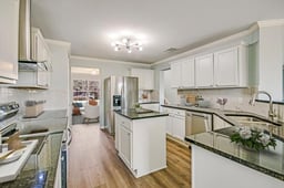 The kitchen features granite countertops, painted cabinetry, a center island, and brand-new stainless appliances that have never been used, all opening to the main living area for an easy, functional layout ideal for both everyday living and entertaining.