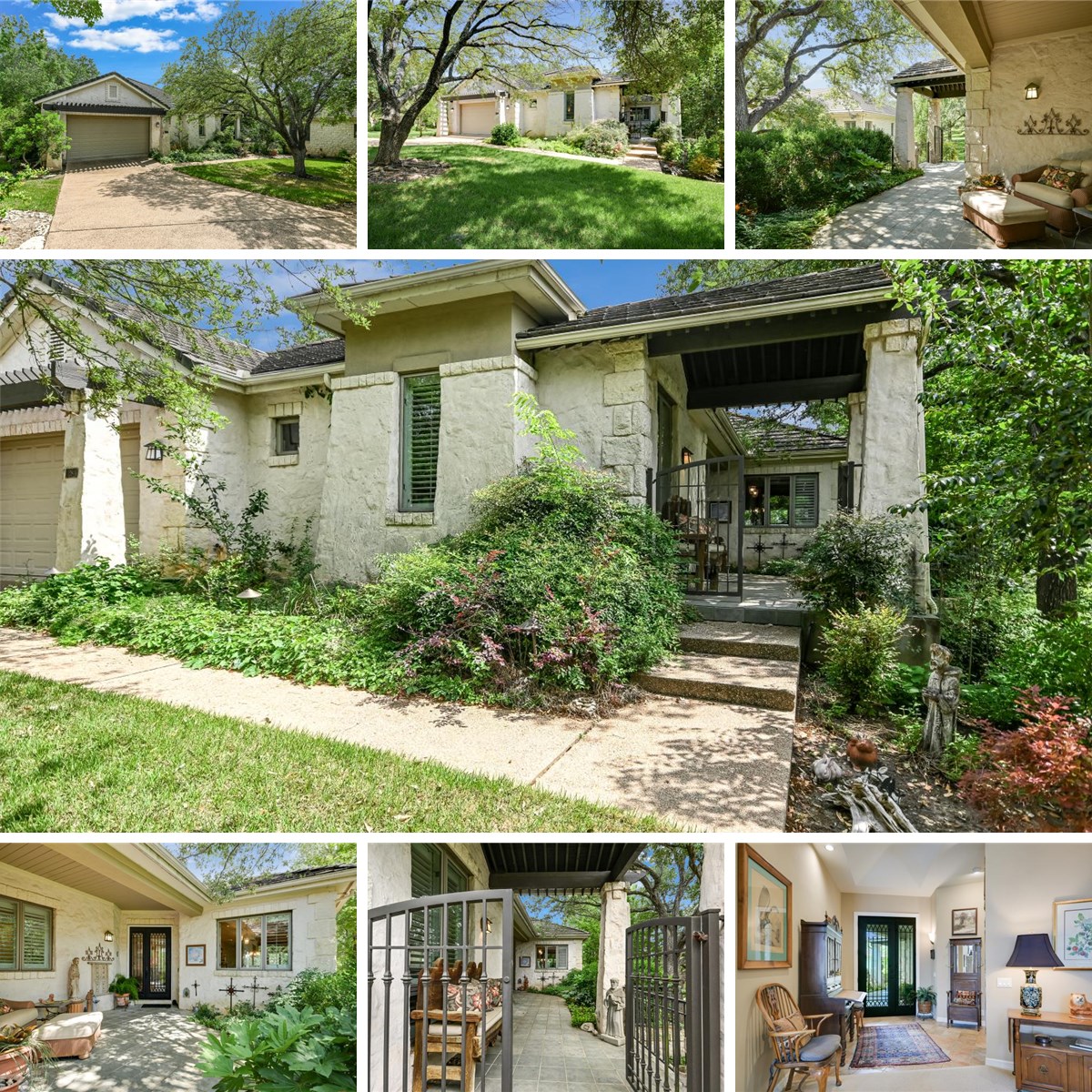 Beautiful three-bedroom single-story, stone garden home in the Fairways at Barton Creek. There are 50 units in the private, gated community, which offers direct access to the Fazio Foothills golf course. Also, nearby and just a golf cart ride away is the Omni Resort and the Barton Creek Country Club with ample restaurant options. Enjoy scenic wooded views of the 2nd hole of the Fazio golf course from the expansive back patio that is covered and uncovered. Large windows bringing in an abundance of natural light and high ceilings add to the beautiful ambiance of this home. The private, gated courtyard greets you at the front of the house, a perfect place for potted plants and relaxing on patio. At the front of the home is a large dining room that opens to the living room that has a double-sided fireplace. On the other side of the stone fireplace is the second living space with the kitchen and kitchen dining area. The kitchen is lovely with a window over the sink, a walk-in pantry, breakfast bar and a center island. The primary suite at the back of the home includes doors to the back patio, two walk-in closets, a soaking tub, double sinks and a walk-in shower. There are two additional large secondary bedrooms, each with their own bathroom. The home has a generous amount of storage space and a large utility room with additional storage and a sink. A true one story with tile and carpet floors throughout, two graciously large living areas, multiple outdoor living spaces, and floor to ceiling windows and doors are just a few of the fabulous features of this stunning home. The two- car-attached garage with additional golf cart garage space. Indulge in the golf and country club community with direct access to the club. Jump into your golf cart and drive over to Barton Creek Country Club. The home is perfect for those seeking a lock and leave lifestyle or a year-round retreat in the Barton Creek community. A beautiful home with a resort-living lifestyle, this home truly has it all. The homeowner pays two HOA dues: the Fairways HOA dues and Barton Creek HOA dues.