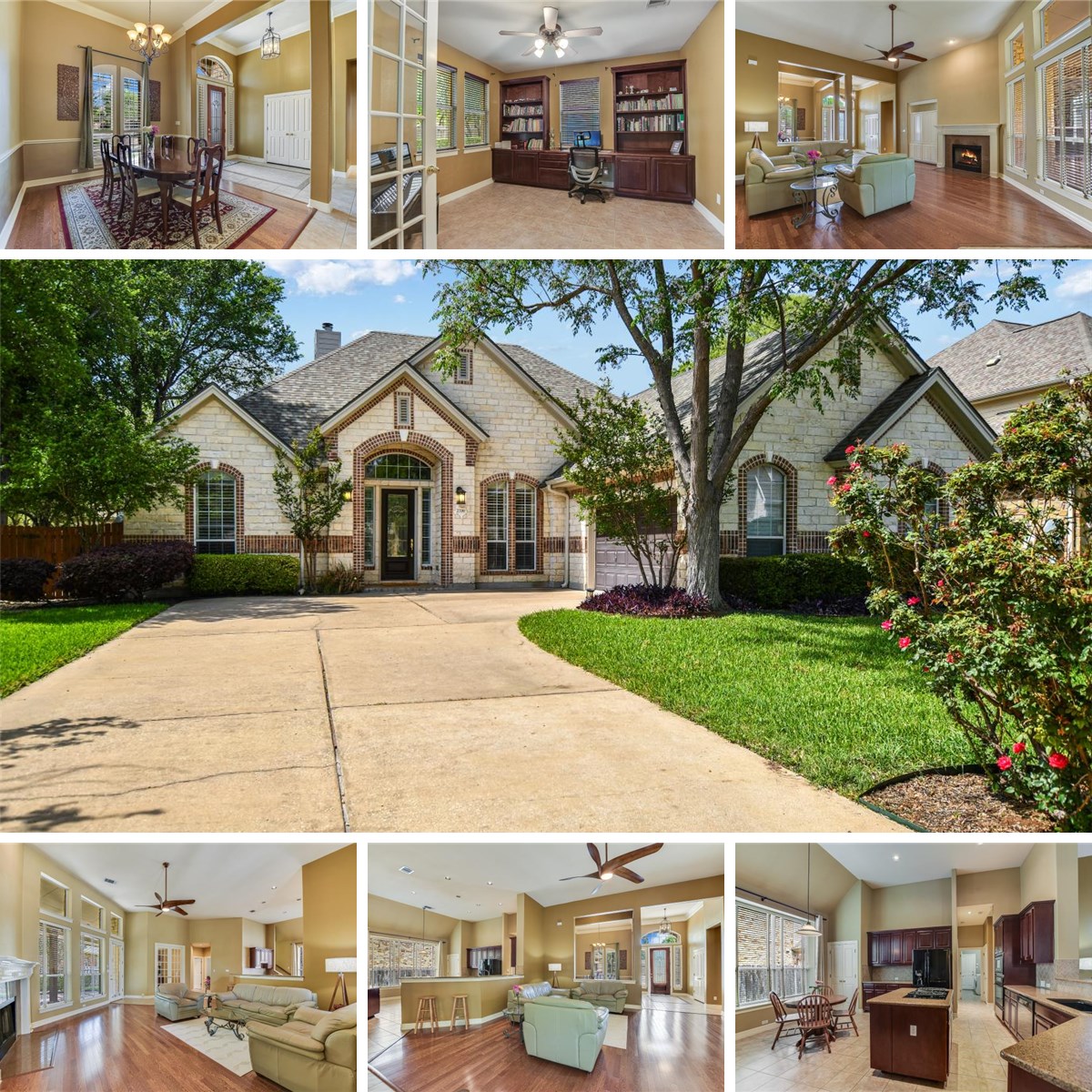 The private primary suite is a true retreat, featuring a bay window, crown molding, and a generously sized bath with dual vanities, soaking tub, separate shower, and walk-in closet. A dedicated study with French doors and serene backyard views creates the ideal work-from-home setting.