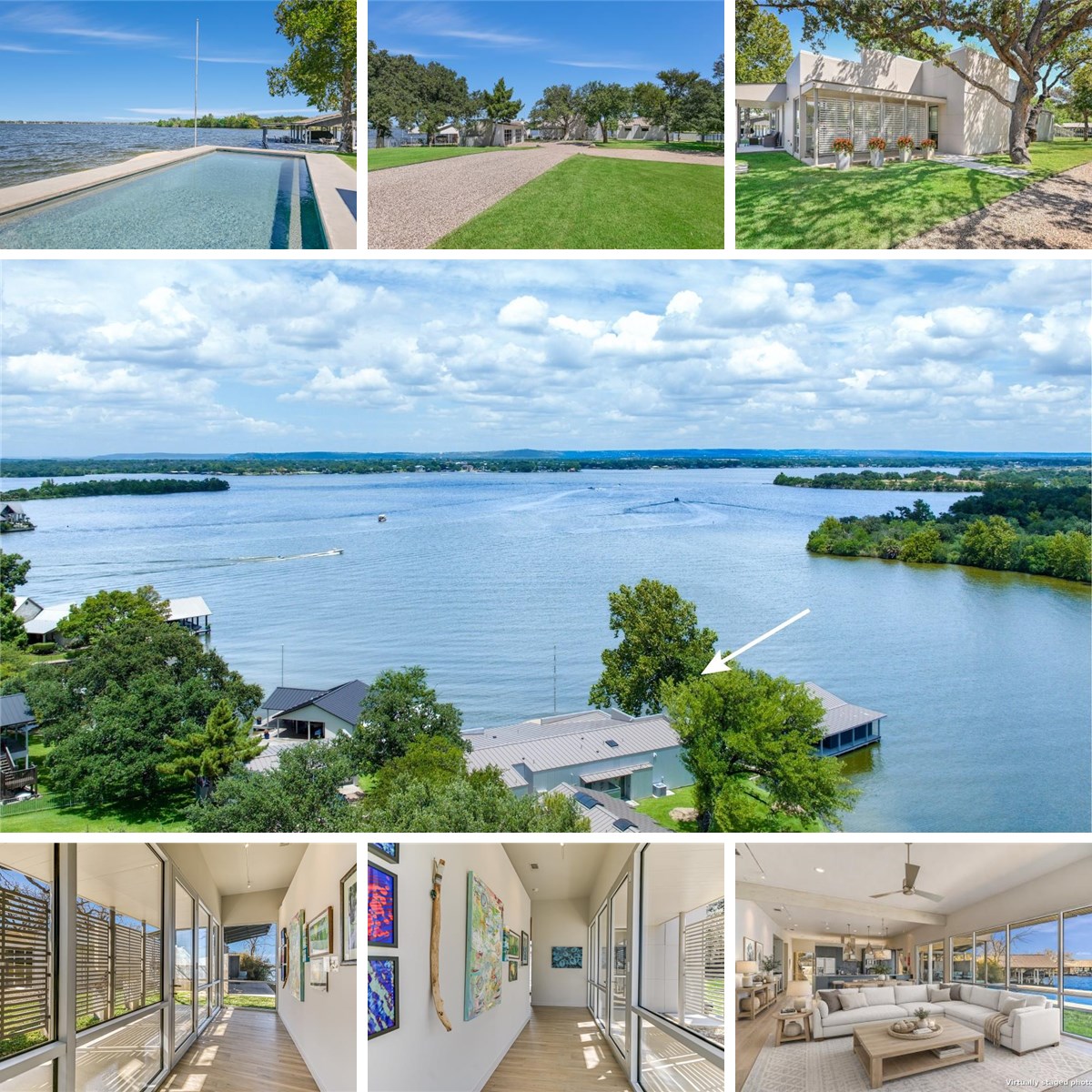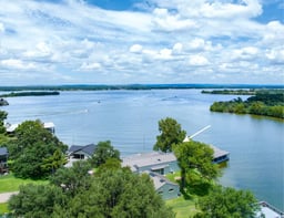 Welcome to 317 Scenic Dr., an exceptional waterfront property offering 287 feet of constant-level Lake LBJ shoreline in Oak Ridge Estates. Set on two expansive lots totaling 0.71 acres, the property is framed by mature trees and a gently curving shoreline. The dual-lot configuration enhances property value and provides space for future expansion or additional structures. Vacant land across the cove is LCRA-owned, preserving the peaceful setting and views from the property. A long, private drive introduces the residence, where clean architectural lines and walls of glass frame uninterrupted lake views. The main living spaces are filled with natural light and anchored by new luxury vinyl plank flooring. The main house features two spacious ensuite bedrooms and 2.5 baths, along with open kitchen, dining, and living areas designed for relaxed lakefront living. A detached bunkhouse offers two additional bedrooms with a Jack & Jill bath, comfortably accommodating up to eight guests. Outdoor living defines the experience. A lakeside pool sits just steps from the shoreline, while patios and shaded seating areas create inviting spaces for lounging. The expansive boat dock features two covered boat slips with lifts, two PWC lifts, a spacious lounging deck, and storage room, functioning like a private waterfront pavilion with effortless access to Lake LBJ. 317 Scenic Dr. presents a rare opportunity to create an extraordinary waterfront retreat on a homesite defined by privacy, scale, and open-water views.