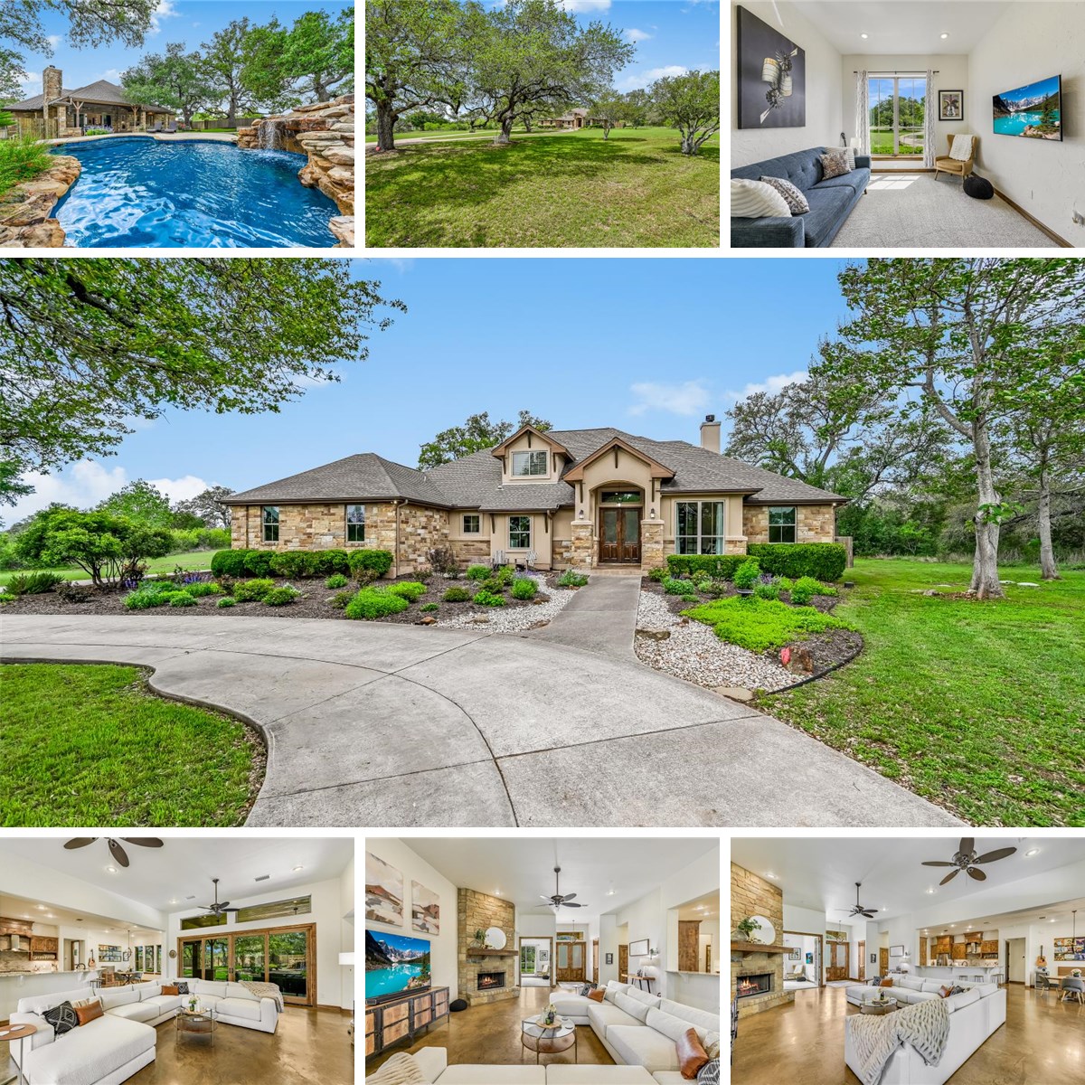 Set on a private 5.78-acre lot in the highly sought-after Ruby Ranch community of Buda, Texas, this beautiful 3-bedroom, 2.5-bath home offers the perfect blend of comfort, privacy, and natural surroundings. A long, winding driveway leads you to the home, passing through majestic 100+/- year-old live oak trees and creating a truly impressive sense of arrival. Designed for both everyday living and entertaining, the open-concept layout features high ceilings and a warm, inviting living area with a fireplace and a large sliding glass door that opens to a covered patio—complete with its own fireplace—for seamless indoor-outdoor living. The backyard is a true retreat, showcasing a stunning pool with a waterfall, all set within a heavily treed landscape that offers shade and tranquility. Adding to the property’s versatility is a detached, 120-square-foot air-conditioned studio, ideal for a private office, creative space, or guest overflow. The spacious primary suite is thoughtfully separated from the secondary bedrooms for added privacy, while a dedicated office inside the main home provides a comfortable work-from-home setup. The kitchen opens to the family room and is equipped with updated stainless steel appliances, offering both style and functionality. Abundant closet storage throughout the home ensures plenty of space for organization. Additional highlights include a 3-car garage and a private well, rounding out the appeal of this exceptional Hill Country retreat.