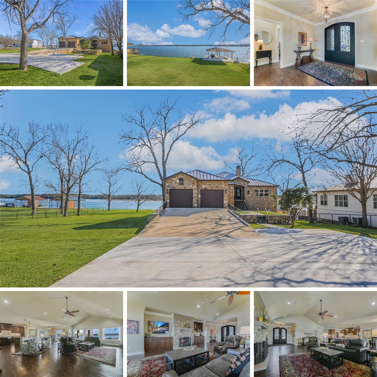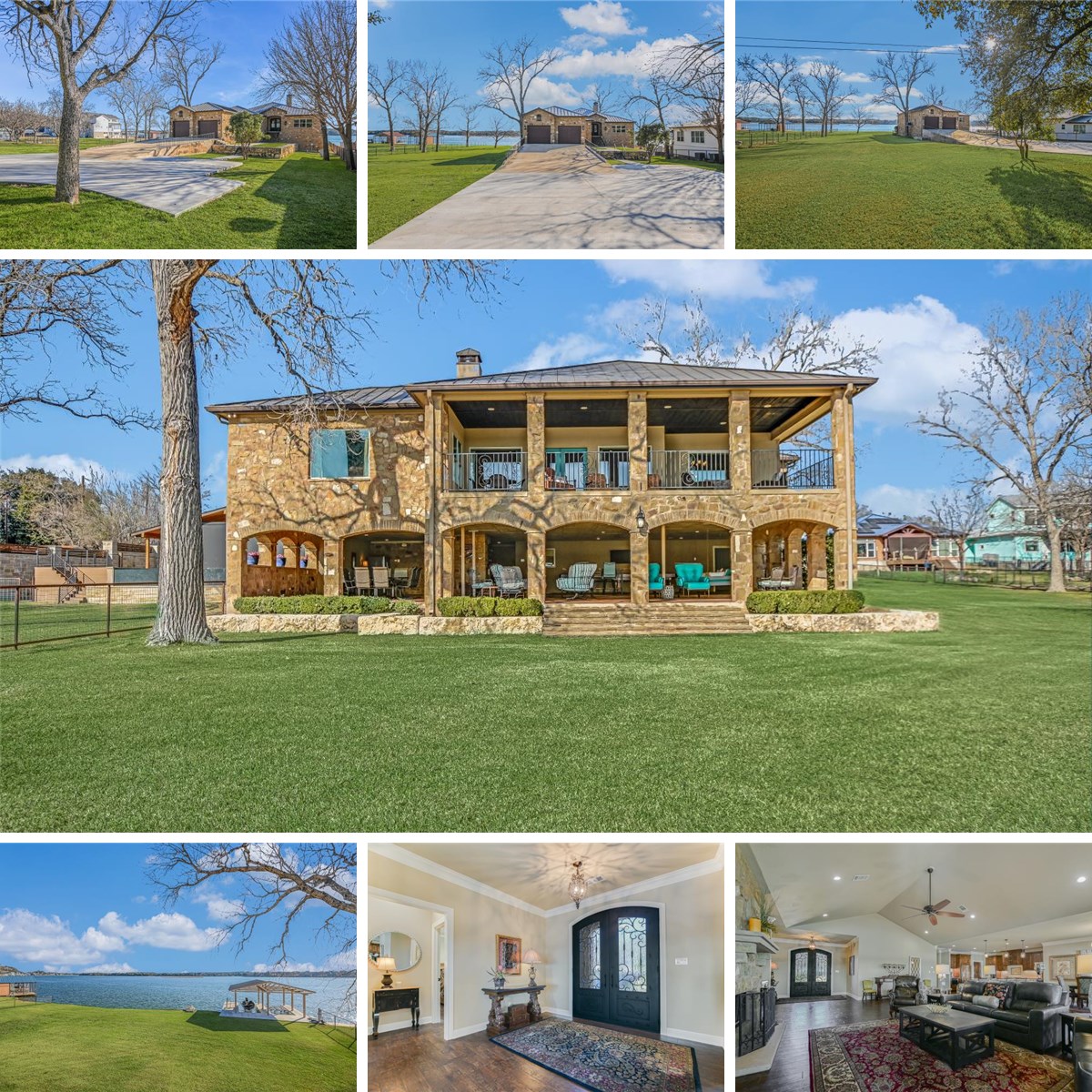 Positioned on two expansive waterfront lots along the constant-level waters of Lake LBJ, 360 Campa Pajama Ln. offers 140 feet of shoreline and sweeping southwest-facing views across the main body of the lake. Built in 2018 with 3-bedrooms, 3.5-baths plus a dedicated study, this 3,295 sq. ft. residence blends comfortable lake living with exceptional indoor and outdoor entertaining spaces. Inside, the open-concept living area features soaring ceilings anchored by a wood-burning fireplace, while expansive windows frame the spectacular lake views and fill the space with natural light. The island kitchen is designed for both function and gathering, offering a large island, convenient butler’s pantry for prep and storage, and a Bosch appliance package including a gas cooktop. Each bedroom features its own ensuite bath, while the study offers a built-in Murphy bed, providing flexible guest accommodations. The spacious primary suite connects to a spa-like bath with double vanity, soaking tub, walk-in shower, and generous closet space. The home’s appeal extends effortlessly to its outdoor living areas. A large covered patio off the main living area provides front-row seats to colorful Hill Country sunsets, while the lower level offers extensive covered outdoor living and storage space including an outdoor kitchen, wood-burning fireplace, powder bath, outdoor shower, and flex room with mini split. A lush, flat lawn extends from the home to the water’s edge, creating an easy connection to the covered two-stall boat dock with lifts and a unique diving board. A gated entry and detached storage building provide secure space for boats, lake toys, and equipment.