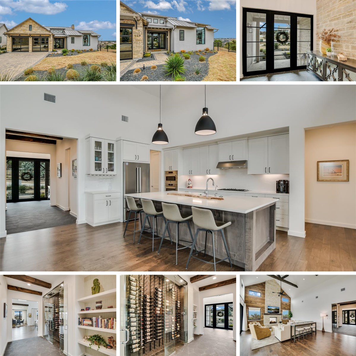 Step inside to discover sophisticated finishes and a striking wine showcase, perfect for entertaining. The open-concept design leads to a wrap-around patio, featuring a dual-sided fireplace and overlooking a private pool—all set against a backdrop of panoramic Hill Country views.