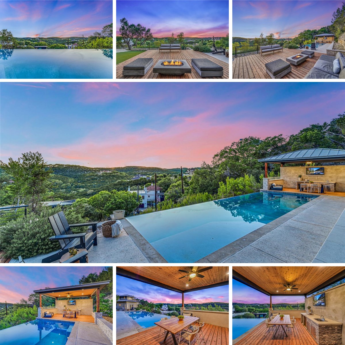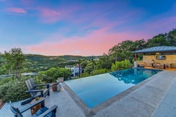 Commanding an elevated hillside setting, this striking custom residence delivers a refined architectural presence paired with sweeping Hill Country and canyon panoramas. Dramatic walls of glass bathe the open-concept interiors in natural light while showcasing vivid sunsets and expansive views. The chef-caliber kitchen anchors the home with premium appliances, a generous island, and effortless flow into the dining and living spaces—crafted for both elevated entertaining and everyday ease. Outdoors, the property unfolds into a true resort-style retreat, highlighted by a breathtaking infinity-edge pool that appears to spill seamlessly into the surrounding hills. A covered cabana with outdoor kitchen and TV creates the perfect setting for entertaining or unwinding while taking in the panoramic views. The experience is complete with a fire pit deck and a turf play area, all framed by native landscaping and dramatic limestone terrain. The primary suite is a true private sanctuary, featuring separate his-and-her spa-inspired bathrooms and walk-in closets, along with a private balcony designed to take in the surrounding Hill Country scenery. The “his” bath offers a rejuvenating steam shower, while the “her” bath is designed for relaxation with a soaking tub set on heated floors—creating a true at-home spa experience. Multiple guest suites, a dedicated office, and versatile bonus spaces create flexibility for hosting, working, and unwinding. Recently refreshed with new paint, new carpet, and thoughtfully remodeled bathrooms and utility room, the home blends timeless design with modern updates. Ideally located within the highly rated Eanes ISD and offering convenient proximity to Lake Austin and Downtown Austin, this home delivers both an exceptional lifestyle and a premier location.