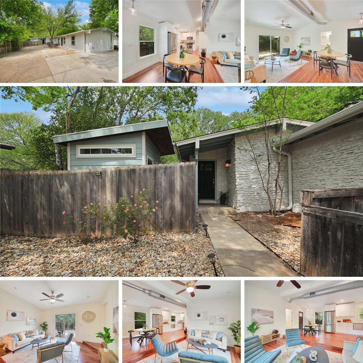 East Austin living minutes from Mueller, coffee, dining, and quick highway access. Private “B” unit tucked back with an oversized yard and native landscaping. Open layout with vaulted ceilings in the living and easy patio access. 2024 kitchen remodel with new cabinetry, countertops, subway tile, stainless sink/appliances, and exposed ductwork for a modern industrial vibe. Light-filled primary with walk-in closet, deck access, and a standout bath featuring a handmade San Miguel sink and soaking tub. Flexible second bedroom with Murphy bed. Guest bath with walk-in shower + separate laundry for added storage. Detached 80 sq ft conditioned studio—perfect for work or workouts. Taken to the studs in 2017 with major system updates. Deck + patio for entertaining with exterior storage. Rare East Austin find under $400K. W/D + fridge convey. Unit A also available.
