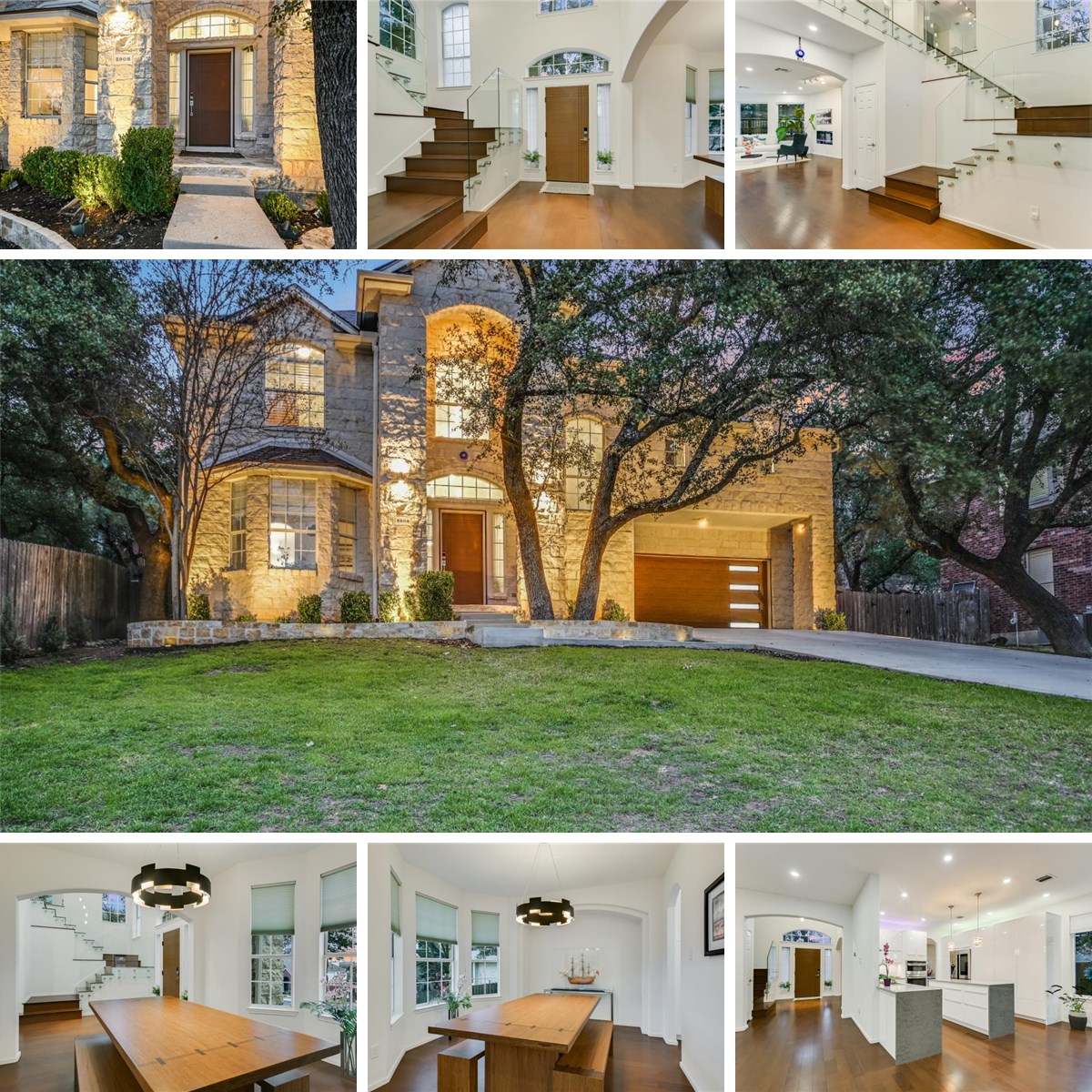 The exterior features a beautiful Texas limestone exterior with LED lighting. Inside, you'll discover an elegant open design with high ceilings, modern glass stairs, and walls of windows providing abundant natural light. The completely redesigned kitchen showcases a quartz waterfall island, premium GE and Samsung appliances, and soft-close cabinetry. High-end engineered wood flooring flows throughout the home.