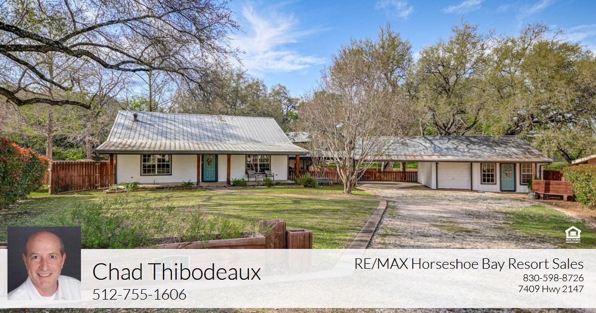 Tucked into a quiet Kingsland waterfront setting on Lake LBJ, this property offers the rare combination of single-level living, a beautifully treed lot, and 155 feet of channel waterfront. Towering, century-old oak trees frame the property, creating a shaded and inviting setting with generous shoreline to enjoy lakeside living. The main home features 2 bedrooms and 2.5 baths with an open-concept layout connecting the living, dining and kitchen areas. Vaulted ceilings elevate the living space, while a wood-burning stove adds warmth and character. Tile flooring runs throughout, offering durability and ease of maintenance. Both bedrooms include private en-suite baths, walk-in closets and direct access to the covered back patio with peaceful channel views leading to the Colorado Arm of Lake LBJ. Outdoor living is a highlight with covered patios at both the front and back, along with a lakeside deck just steps from the water. The expansive waterfront spans two lots, providing space to tie up a boat or Jet Skis, with room to spread out and enjoy the setting. A detached 1-bedroom, 1-bath guest house with kitchenette provides comfortable space for guests or extended stays. It is connected to a 1-car garage and 2-car carport, offering excellent storage and a practical solution for keeping a boat or Jet-Skis protected. A nearby community boat ramp adds convenient access to the lake, completing a setting designed to fully enjoy the waterfront. Schedule your showing today. Interior photos have been virtually staged.