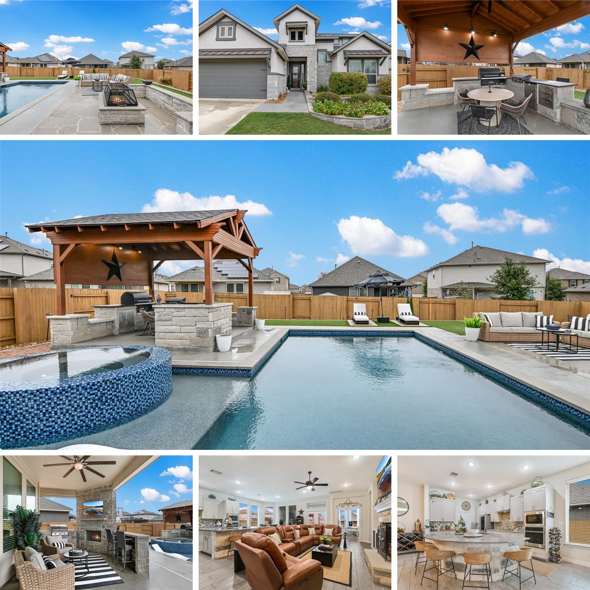 616 Muster Bend offers a thoughtfully designed home with flexible living space and standout outdoor features. Built in 2019, this 4-bedroom, 3-bath residence spans approximately 2,651 square feet with the main bedroom located on the first level and a dedicated study suitable for work or hobbies. The kitchen opens to the main living area and features upgraded finishes, generous counter space, and storage designed for everyday use and entertaining. High ceilings and a gas fireplace add dimension and warmth to the central living space. The layout provides separation between bedrooms while maintaining a connected flow throughout the home. The outdoor living is a key highlight. The backyard includes a well-appointed in-ground pool with spa, an outdoor kitchen positioned near the pool, and additional entertaining space under the covered back porch with a second grill and an outdoor fireplace. A separate firepit area and custom landscaping create multiple options for gathering and relaxation. Other noteworthy features include: 2.5 car garage, a .268-acre lot, new roofing in 2025. This home is conveniently located near Toll 130, and is under five miles from Historic Downtown Georgetown and approximately 10–15 minutes from both Round Rock Premium Outlets and Ascension Seton Williamson Hospital.