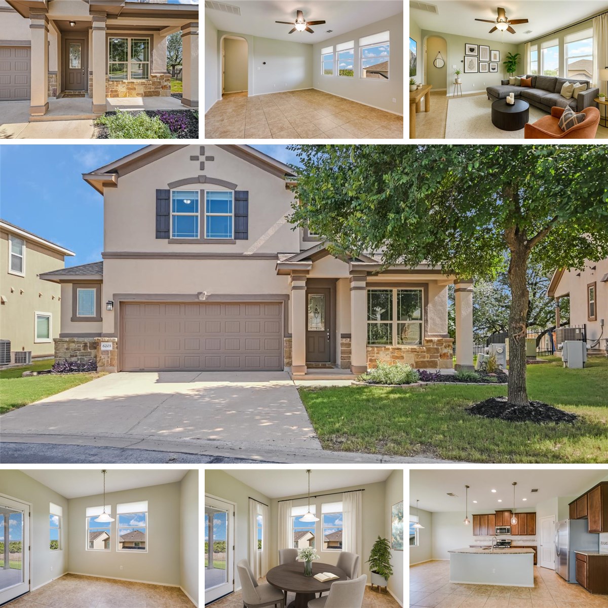 Welcome to your serene retreat at 6203 Aviara Drive. This home offers a functional and peaceful living environment, incorporating a main-level layout that's ideal for entertaining, private upstairs bedrooms, breathtaking hilltop views, and a spacious 2.5-car garage. Inside, the main level features an open-concept design that’s centered around the beautiful kitchen, offering abundant cabinetry, granite counters, a large island with pendant lighting, and stainless steel appliances, including a new dishwasher and microwave (2023). A dedicated home office provides you with a comfortable work-from-home setting, ensuring all bedrooms remain for their intended use. Upstairs, a versatile bonus room is suitable for a cozy living space, a game room/playroom, or a second office. The intentional layout upstairs ensures no bedroom shares a wall, maximizing privacy for everyone. The primary suite is a true retreat, offering a generous bedroom, a sizable nook for a sitting area or even a nursery, and an ensuite bath featuring a soaking tub, separate shower, and an expansive closet. This home fully embraces outdoor spaces with a charming front porch and a spacious backyard with unobstructed views. Enjoy a fruitful fig tree and the beauty of wildlife sightings, including birds, owls, and foxes. Plus, benefit from direct access to trails within the adjacent green space. Additional highlights include a 5kW Solar Energy System, fresh int/ext/garage paint, premium carpet/pad replacement (2024), HVAC (2021), water heater (2020), and spray foam insulation. This welcoming gated community invites you in with intentional landscaping and friendly neighbors, and the home is just a short stroll from the community pool and pavilion, both offering stunning hilltop views. The prime location ensures a peaceful living environment without sacrificing convenience, with Costco, HEB, Target, Whole Foods, restaurants, and downtown all within easy reach.