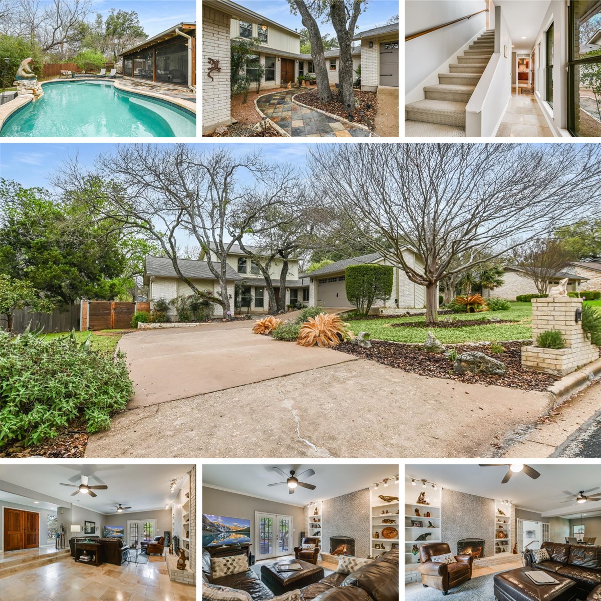 This remarkable home is as distinctive as it is welcoming — the creation of a renowned bronze sculptor whose artistic vision is woven into every detail. Set on one of the area's larger lots and backing to an arroyo, the property commands immediate attention with its side-entry garage and lush, mature landscaping, while offering privacy all around. Step inside to a hand-painted mural that greets you at the entry, setting the tone for the artistry throughout. French doors draw you toward a large screened patio overlooking a resort-style pool by Texas Pools, finished with NPT Pool Glass Beads. Multiple decks invite gathering, while the outdoor fireplace features a truly singular focal point: a SteinKern — the inner cast of a fossilized giant clam — embedded in the firebox face. Two ammonite designs set in Mexican River stone complete the patio's sculptural landscape. Sellers have invested over $200K in thoughtful upgrades for a move-in ready experience, including the beautiful pool, a whole-house Generac generator, updated HVAC systems, a recent roof with seamless 6" gutters and leaf guards, fresh interior paint, beautiful tile work throughout, and a renovated kitchen. The flexible floor plan includes 3 bedrooms and 2 offices (one currently used as an artist's studio), with the option to convert to 4 bedrooms plus an office. Located minutes from dining, shopping, and entertainment, with effortless access to the Arboretum, the Domain, and Downtown Austin. This is peaceful neighborhood living without sacrificing city convenience. Opportunities like this don't come twice.