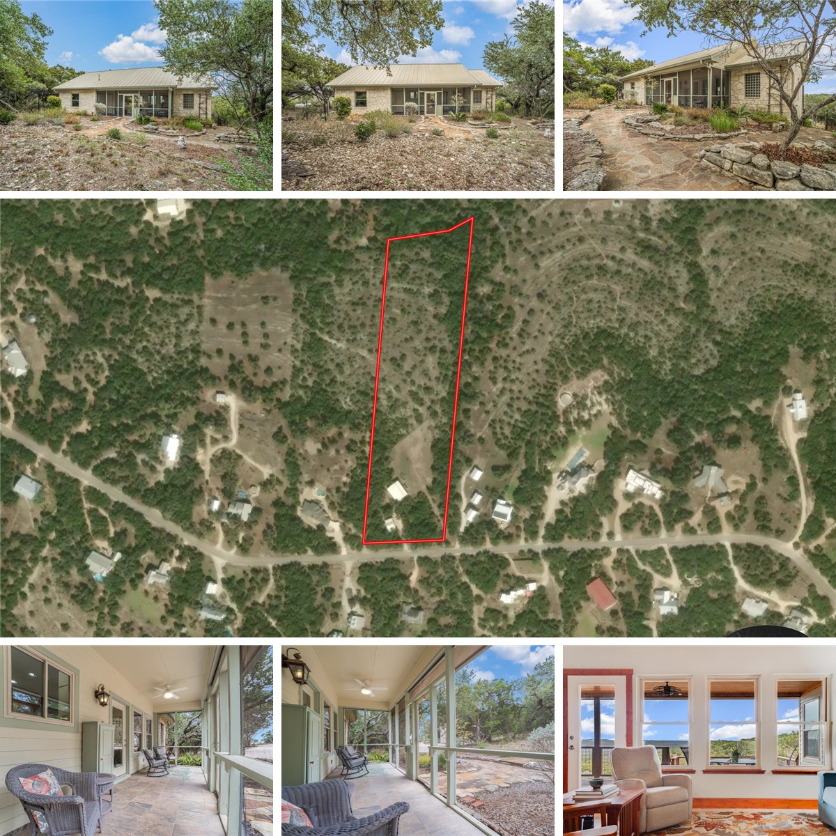 Nestled among mature the oaks and cedars, this scenic 5.99 acre property offers a beautifully situated 3-bedroom, 2-bath main home plus a charming guest house. As you travel down the tree-lined driveway, you first arrive at the guest house and detached two-car carport, setting the tone for the privacy and tranquility that define this property. The main residence is positioned to take full advantage of sweeping views across the acreage. A flagstone path winds through native landscaping to the front door, where you enter through a screened porch and immediately take in the stunning vistas. Inside, the home features an open-concept floor plan with split bedrooms and abundant natural light. The custom kitchen is a standout with granite countertops, stainless steel appliances, a propane range, and a center island, flowing seamlessly into the dining area—ideal for entertaining. The living room boasts a vaulted ceiling and expansive views that bring the outdoors in. The primary includes a cozy sunroom featuring sweeping views of the Hill Country. The tastefully remodeled primary bath offers dual vanities, a glass-enclosed tub/shower combination, and a custom designed closet (second closet in primary bedroom). Two secondary bedrooms and a full bath are located on the opposite side of the home, each enjoying its own unique outlook. Outdoor living is enhanced by a partially covered, two-tiered deck overlooking the fenced backyard—perfect for pets and relaxation. Just across the driveway, the guest house provides additional flexibility with a living area, bathroom, generous walk-in storage, and a loft upstairs. Guest house has approximately 624 sf. Located in desirable Skyline Ranch Estates, this exceptional property offers peaceful Hill Country living just minutes from downtown Wimberley.